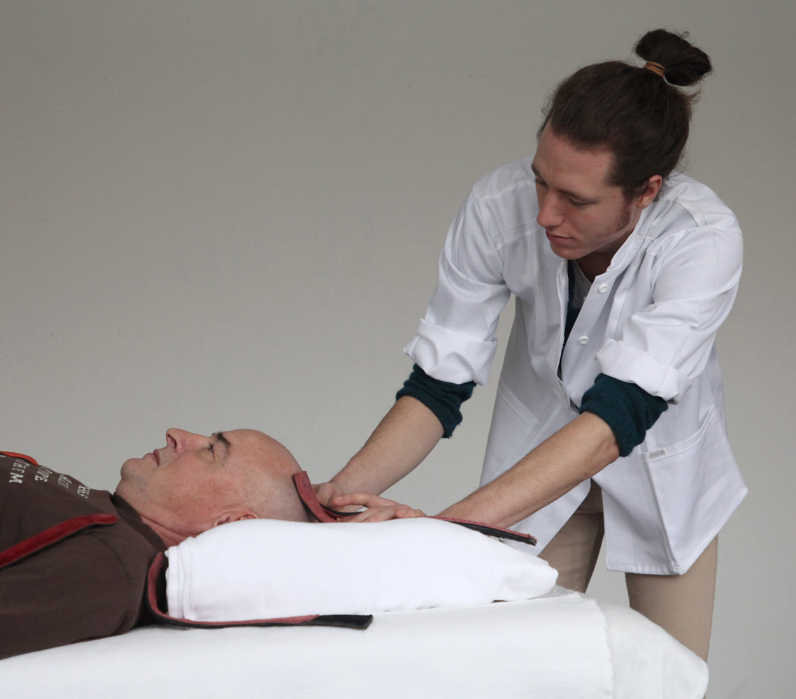 La séance commence par une phase de courte relaxation naturelle sur une table de massage. Le corps relache un maximum de tension et se prépare pour le processus de soin.